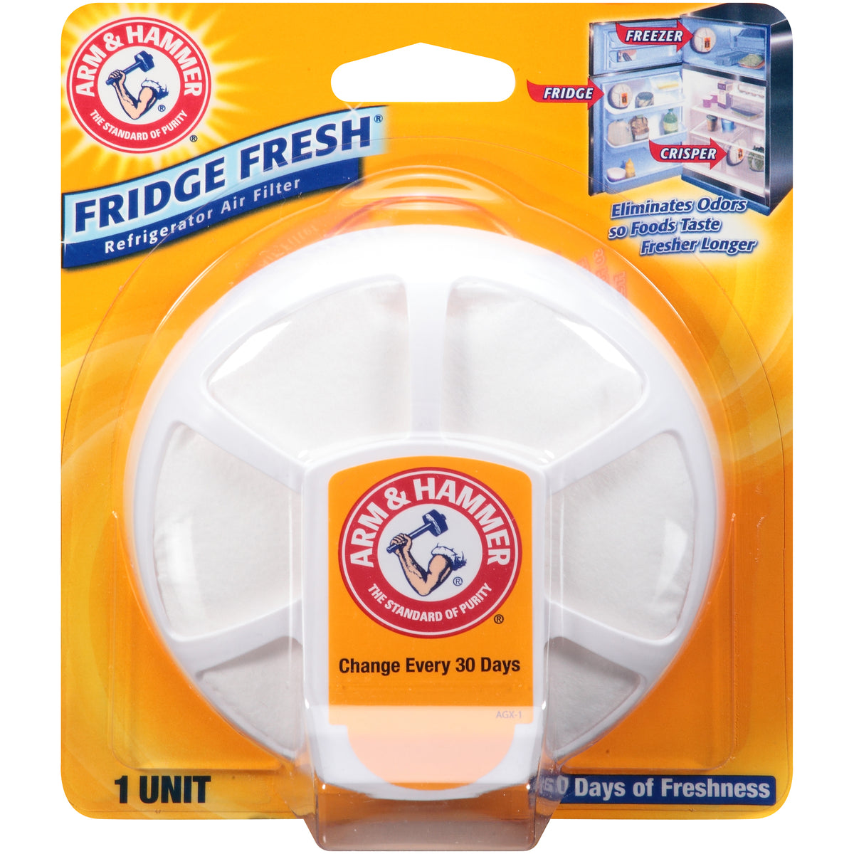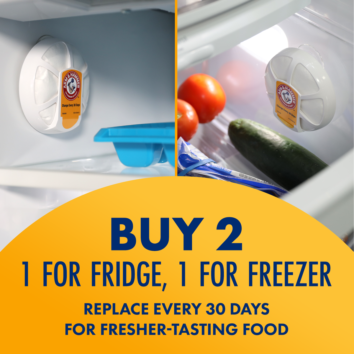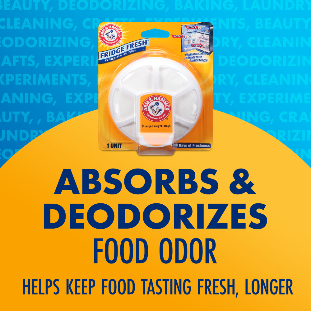 ARM & HAMMER Fridge Fresh Refrigerator Air Filter eliminates odors inside the refrigerator, freezer, or crisper to help keep food tasting fresh, longer. This pure and natural ARM & HAMMER Baking Soda odor eliminator uses a unique flow-through vented design. With an easy-to-apply suction cup design, it sticks to most refrigerators, freezers, and crisper surfaces to help absorb and deodorize food odors where you need it most. To use, select a clean and smooth surface inside your refrigerator, freezer, or crisper. Firmly press the unit onto the surface and hold for 10 seconds. If your freezer wall is coated with frost, wipe away frost prior to mounting. For best results, replace your ARM & HAMMER Baking Soda Fridge Fresh Refrigerator Air Filter every 30 days. Stick it to bad fridge odors with this air filter from ARM & HAMMER, America’s #1 trusted Baking Soda brand.