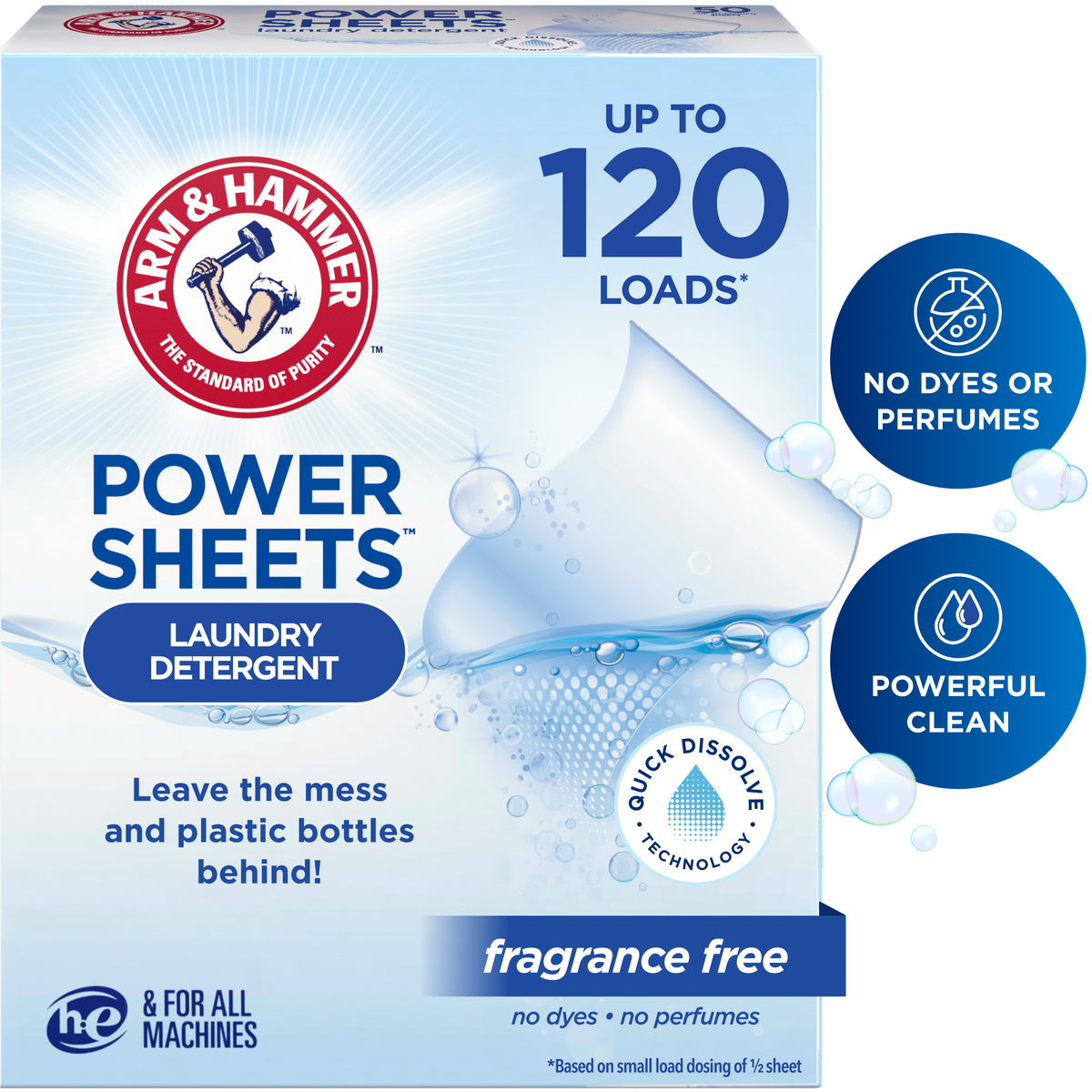 - One 60 count box of ARM & HAMMER Power Sheets Fragrance Free Laundry Detergent cleans 60 medium or up to 120 small loads when used as directed; these concentrated sheets deliver a powerful, deep clean on dark or white clothing with no bleach.