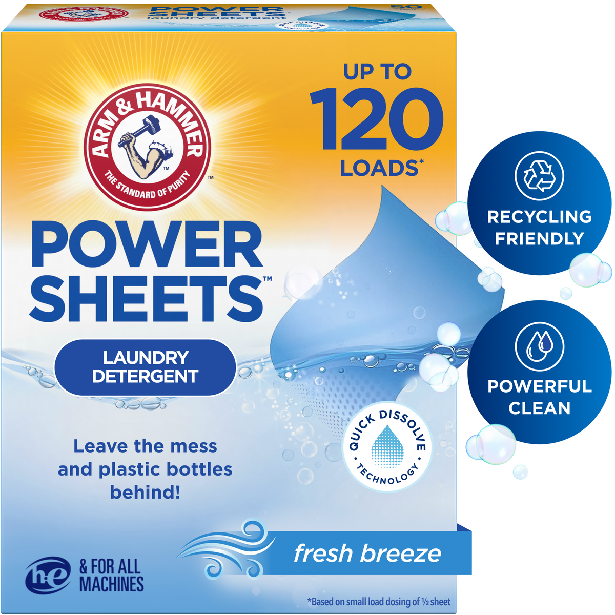 - One 60 count box of ARM & HAMMER Power Sheets Fresh Breeze Laundry Detergent cleans 60 medium or up to 120 small loads when used as directed; these concentrated sheets deliver a powerful, deep clean on dark or white clothing with no bleach.