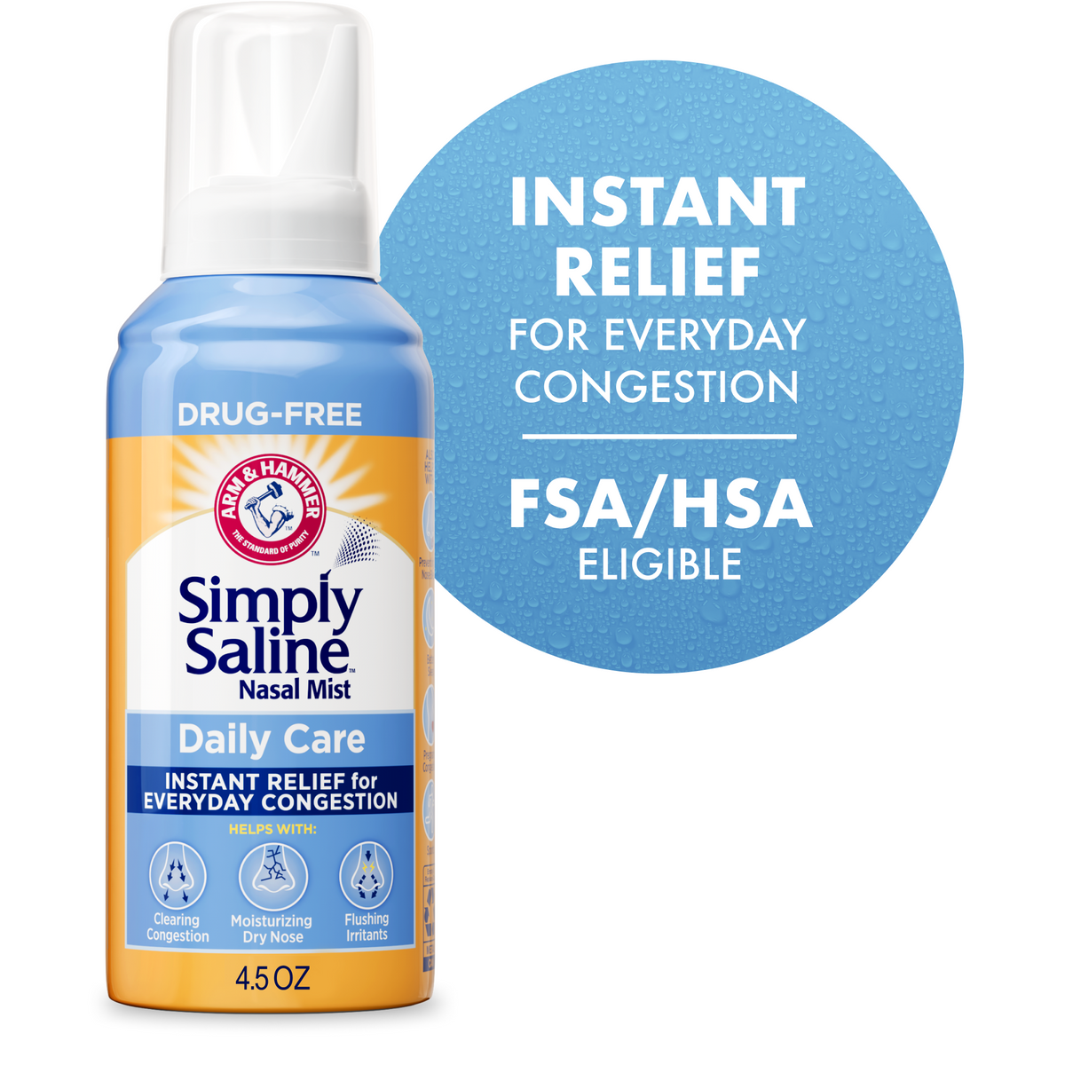 - 4.5 oz ARM & HAMMER Simply Saline Daily Care Nasal Mist saline nasal spray provides instant relief for everyday nasal congestion while gently clearing and moisturizing dry noses.